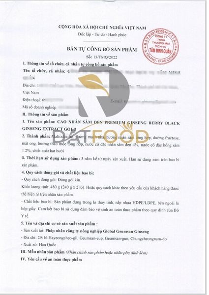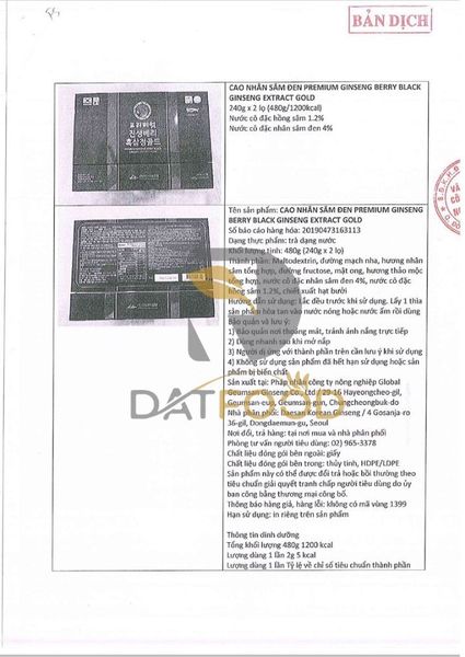 Công bố sản phẩm Cao hắc sâm Daesan Hàn Quốc hộp 2 lọ * 240g chính hãng