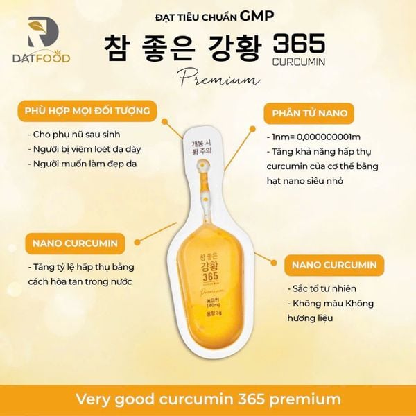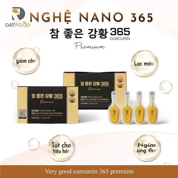 Tinh chất nghệ Nano 365 Curcumin Premium Hàn Quốc là phiên bản nâng cấp so với bản Nano Curcumin 365 Gold được tinh chế từ nghệ tươi tự nhiên, chứa hàm lượng Curcumin cao gấp nhiều lần so với các loại thông thường. Đây là giải pháp lý tưởng để chăm sóc sức khỏe, cải thiện hệ tiêu hóa, hỗ trợ trị viêm loét dạ dày, giúp trị nám tàn nhang, thúc đẩy liền sẹo, tái tạo da và ngăn ngừa lão hóa giúp da phụ nữ căng mịn tươi trẻ.
