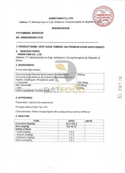 Thành phẩm là tinh chất nghệ Nano 365 Curcumin hòa tan trong nước, lọc bỏ sạch tạp chất, không còn mùi hắc hay vị đắng của củ nghệ nên từ người lớn đến trẻ em ai cũng có thể dễ dàng sử dụng. Sản phẩm được nghiên cứu bởi các chuyên gia hàng đầu và sản xuất trên quy trình hiện đại bậc nhất Hàn Quốc. Nghệ tươi được trồng và thu hoạch đảm bảo vệ sinh, quy trình điều chế kiểm định nghiêm ngặt, không chứa hóa chất, chất bảo quản, tạo màu, độ tinh khiết cao.